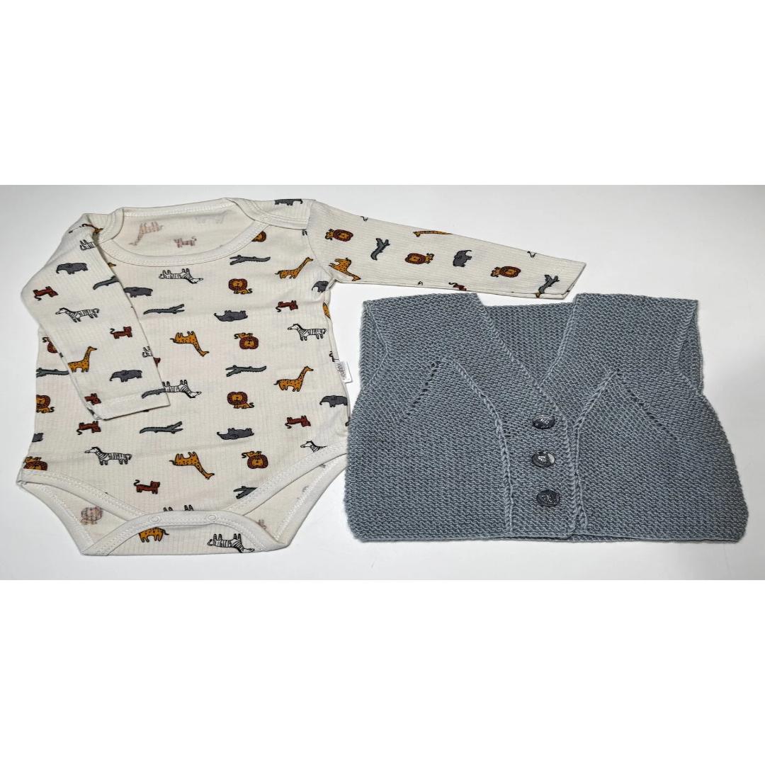 El örgüsü gri yelek ve zıbın kombinasyonu, bebeğinizin şıklığını tamamlar.;