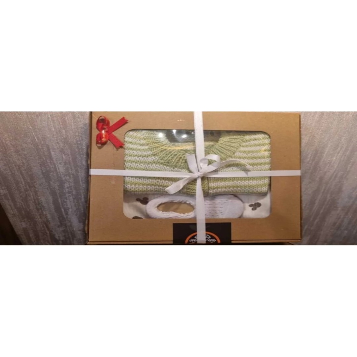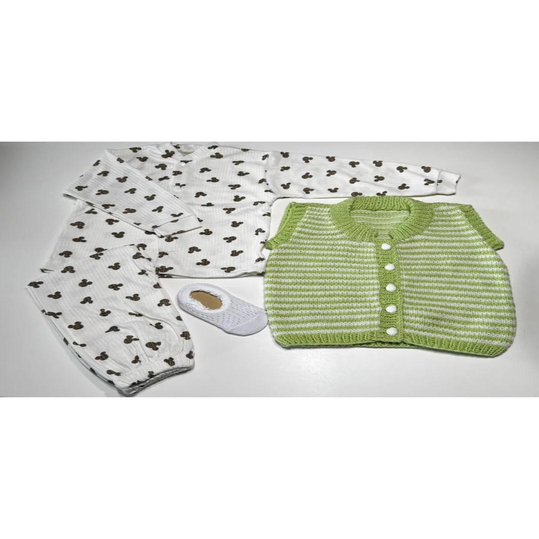 El örgüsü yeşil-beyaz yelek ile pijama takımı ve babet çorap kombinasyonu, çocuğunuzun şıklığını tamamlar.;