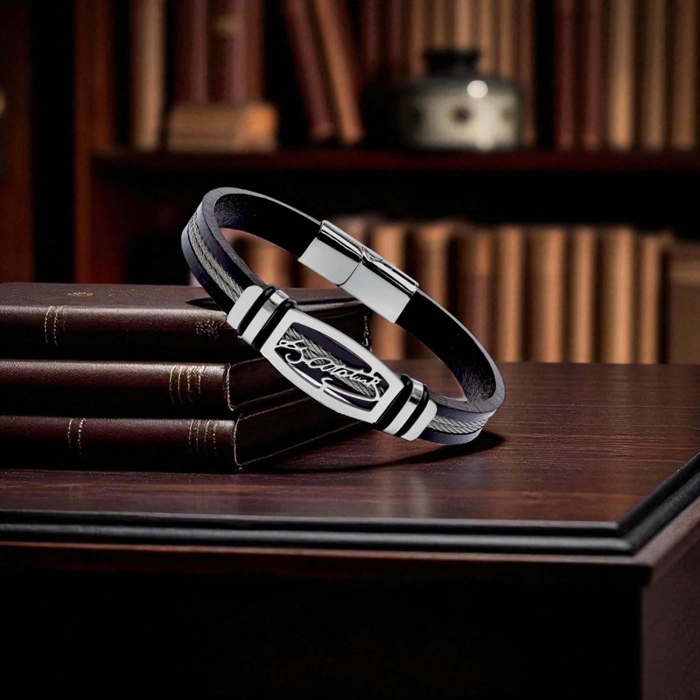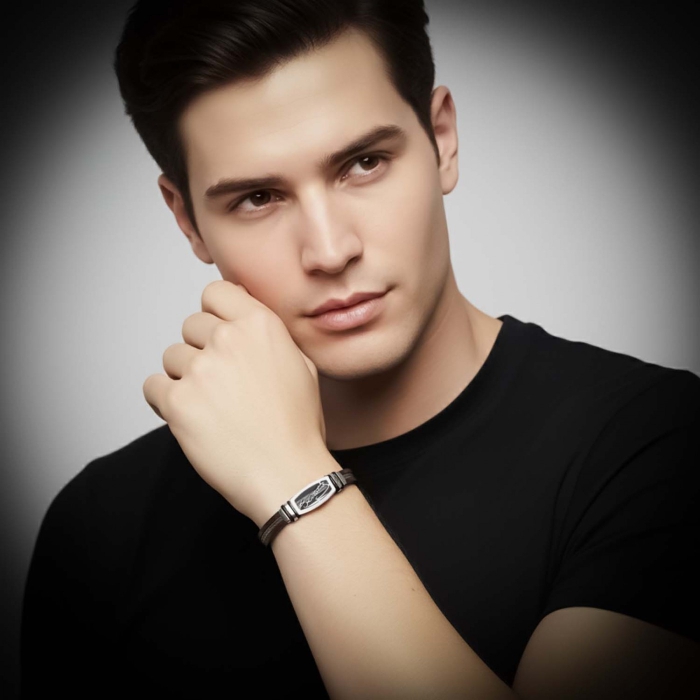 Anlamı güçlü, çizgisi modern: Merkezde Atatürk imzası siluetiyle lazer kesim yapılmış parlak paslanmaz çelik plaka; her iki yanda temiz hatla ilerleyen çelik halat kanalları ve düz kesit deri kordon ile bir araya geliyor. Siyah zeminli plaka kontrastı, vitrinde ilk bakışta okunur bir silüet oluşturur; seçici bir müşteri kitlesine doğrudan hitap eder. Düz kordon taşıyıcı yoğun denemelerde şeklini korur; plaka merkezde sabit durur, halat kanallarının hatasız yönlendirmesi kaymayı engeller. Böylece riski azalır; yeniden sipariş ve stok planlaması öngörülebilir hâle gelir. Renk paleti (koyu deriparlak çeliksiyah vurgu) gümüş tonlu saat, zincir ve minimal yüzüklerle kolay kombinlenir.