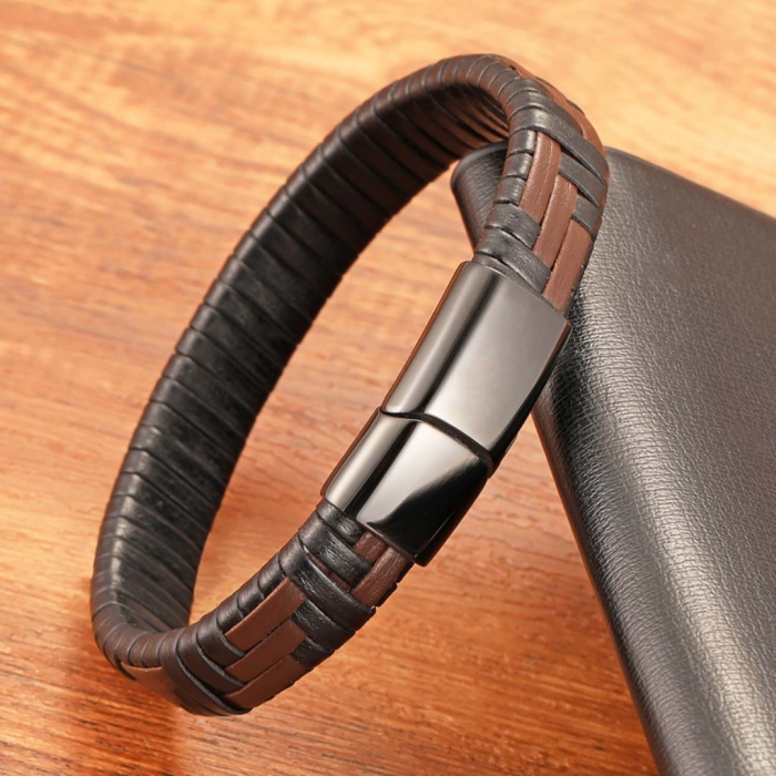 Kahve ve Siyah Deri Örgü ve Çelik Bileklik
