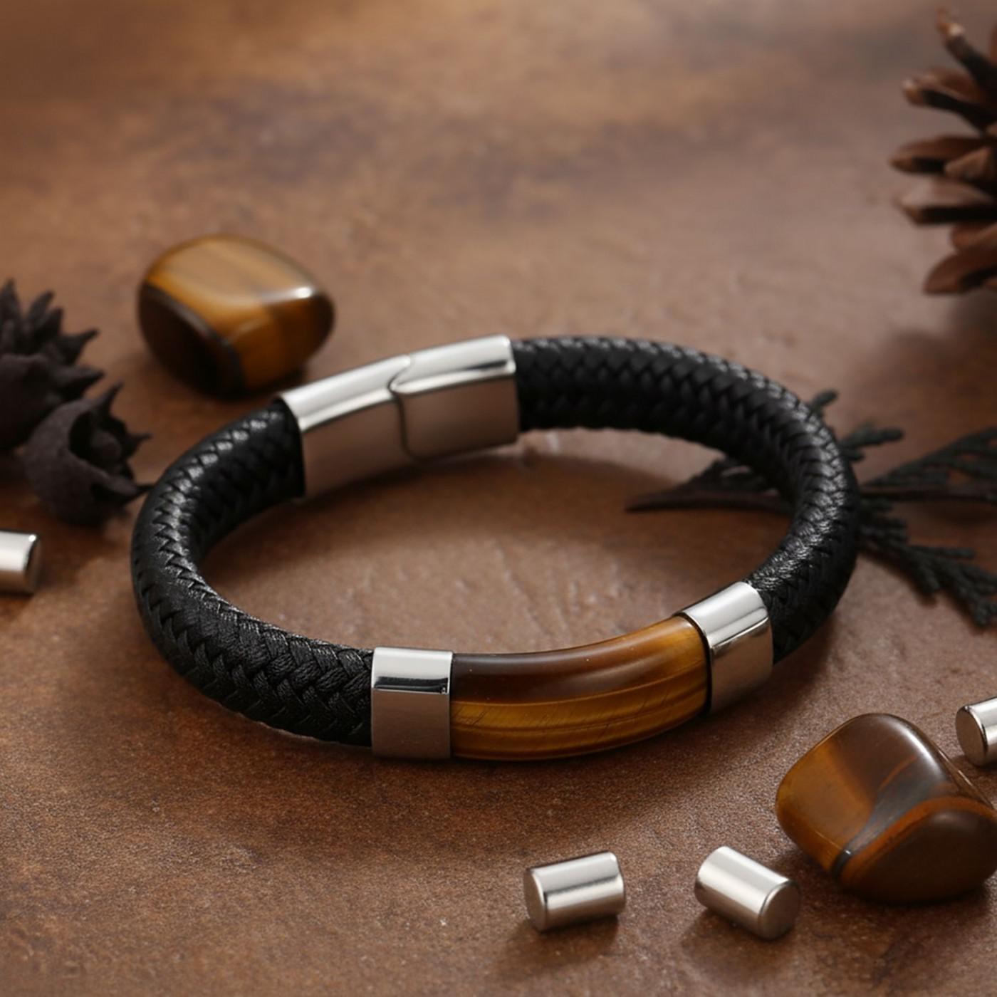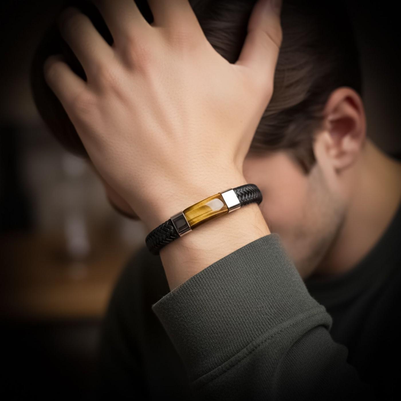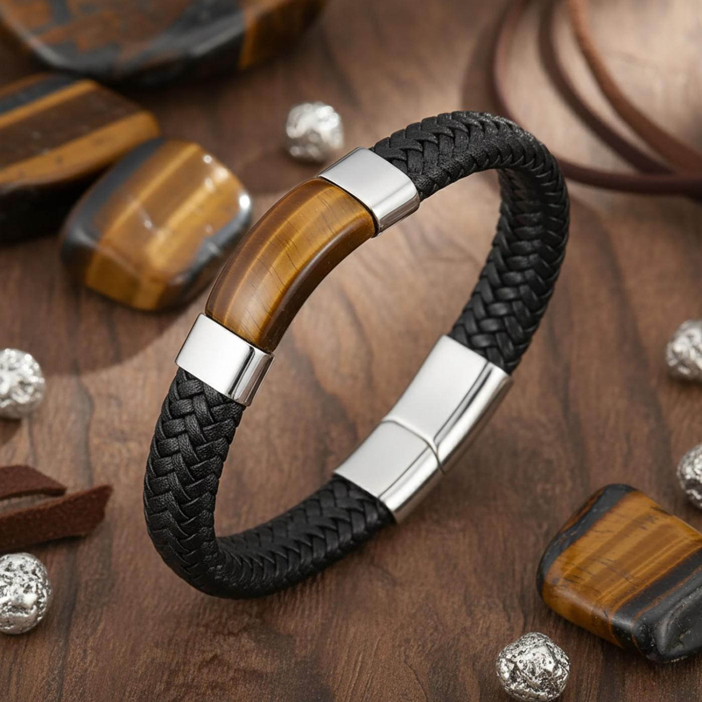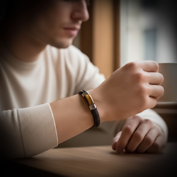 Erkek stilinin en güçlü tamamlayıcılarından biri olan bu siyah deri bileklik, zarif tasarımıyla modern görünüm ve güçlü karakteri bir araya getirir. Merkezinde yer alan kaplan gözü taşı, doğadan gelen enerjisiyle özgüveni temsil ederken, örgü formundaki orijinal deri dokusu bileğinizde maskülen bir duruş oluşturur.